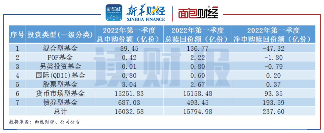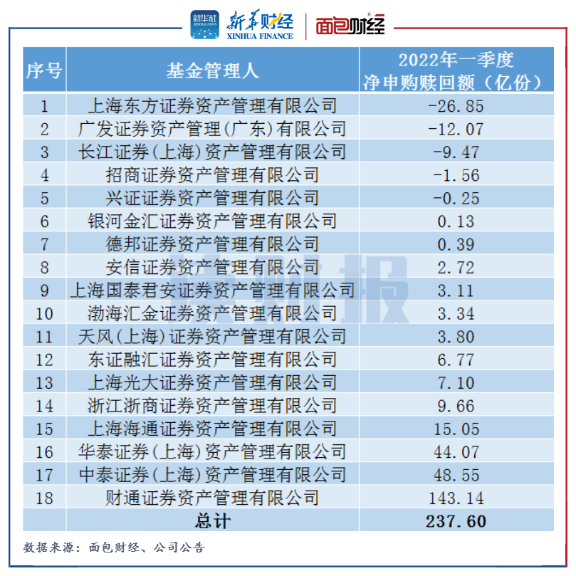 面包財(cái)經(jīng)和新華財(cái)經(jīng)對18家券商資管子公司旗下產(chǎn)品一季報(bào)的統(tǒng)計(jì)發(fā)現(xiàn),2022年一季度,由券商資管子公司管理的500余只開放式公募基金產(chǎn)品份額凈申購合計(jì)237.6億份,其中總申購16032.58億份,總贖回15794.98億份。