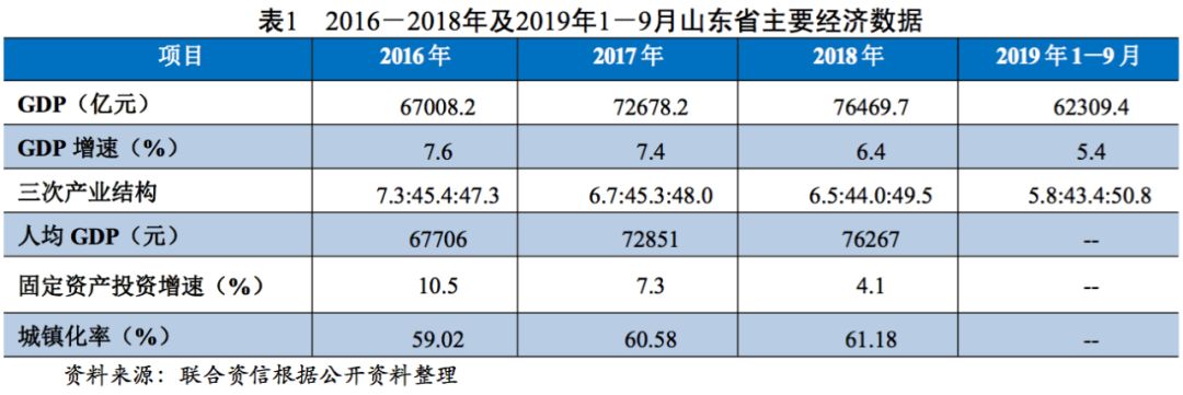 從經(jīng)濟(jì)運(yùn)行方面看,山東省近三年經(jīng)濟(jì)保持穩(wěn)定增長(zhǎng),產(chǎn)業(yè)結(jié)構(gòu)更趨優(yōu)化,整體經(jīng)濟(jì)環(huán)境向好。2016-2018年,山東省分別實(shí)現(xiàn)地區(qū)生產(chǎn)總值67008.2億元、72678.2億元和76469.7億元,經(jīng)濟(jì)規(guī)模在全國(guó)處于上游水平;增速分別為7.6%、7.4%和6.4%,2018年增速低于全國(guó)平均水平,增速有所放緩;三次產(chǎn)業(yè)結(jié)構(gòu)由2016年的7.3:45.4:47.3調(diào)整為6.5:44.0:49.5,第三產(chǎn)業(yè)占比不斷增長(zhǎng),產(chǎn)業(yè)結(jié)構(gòu)更趨優(yōu)化。固定資產(chǎn)投資方面,2018年,山東省固定資產(chǎn)投資(不含農(nóng)戶)比上年增長(zhǎng)4.1%,增速低于全國(guó)增速1.8個(gè)百分點(diǎn),增速較2017年的7.3%有所放緩,三次產(chǎn)業(yè)投資構(gòu)成為1.7:39.5:58.8,服務(wù)業(yè)投資比重比上年提高10.3個(gè)百分點(diǎn)。全年房地產(chǎn)開發(fā)投資7553.0億元,比上年增長(zhǎng)13.8%。2019年1-9月,山東省實(shí)現(xiàn)地區(qū)生產(chǎn)總值62309.4億元,按可比價(jià)計(jì)算,增長(zhǎng)5.4%,仍低于全國(guó)平均增速;其中,三次產(chǎn)業(yè)結(jié)構(gòu)調(diào)整為5.8:43.4:50.8,服務(wù)業(yè)占比同比提高1.5個(gè)百分點(diǎn)。2019年前三季度山東省經(jīng)濟(jì)運(yùn)行繼續(xù)保持平穩(wěn)發(fā)展勢(shì)頭。