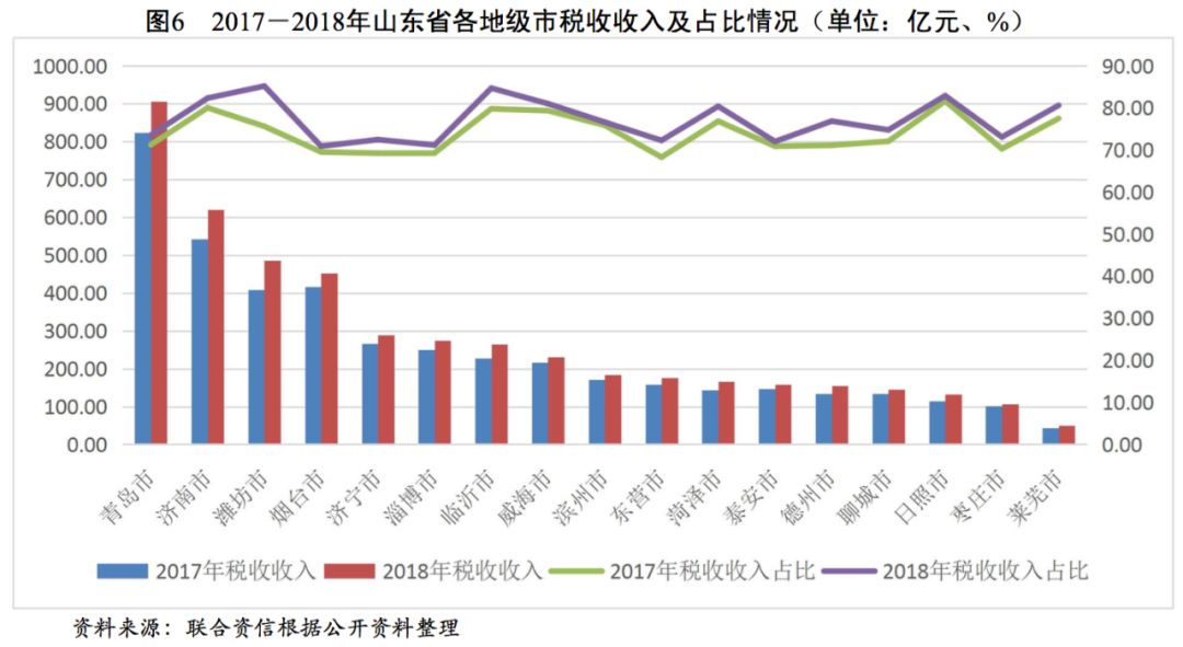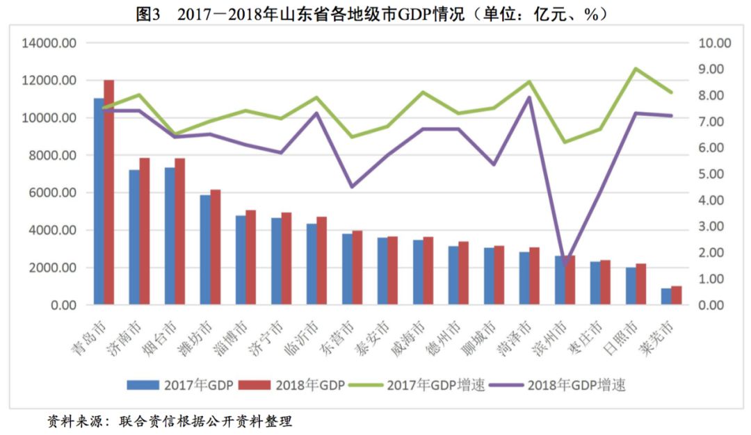 山東省各地級(jí)市經(jīng)濟(jì)發(fā)展分化程度較高,其中以青島市、煙臺(tái)市等沿海城市為主的藍(lán)色半島經(jīng)濟(jì)區(qū)的經(jīng)濟(jì)和財(cái)政實(shí)力明顯高于其他區(qū)域。青島市作為計(jì)劃單列城市及副省會(huì)城市,經(jīng)濟(jì)發(fā)展水平處于領(lǐng)先地位,省會(huì)濟(jì)南市和煙臺(tái)市具有較強(qiáng)的經(jīng)濟(jì)實(shí)力,綜合實(shí)力排在青島市之后。
