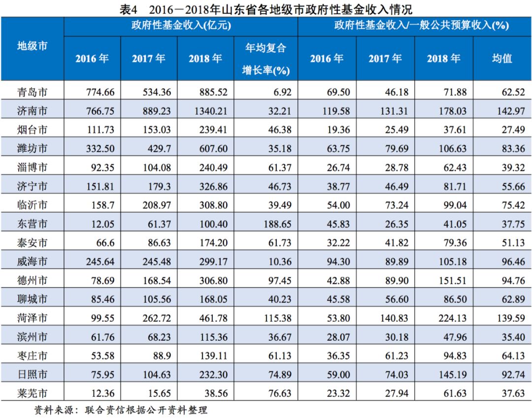從政府性基金收入來看,山東省各地級(jí)市收入分化較重,其中濟(jì)南市的收入規(guī)模最大,2018年達(dá)1340.21億元,遠(yuǎn)超其他地級(jí)市,其次為青島市和濰坊市,2018年分別為885.52億元和607.60億元,其余地級(jí)市政府性基金收入規(guī)模均在500億元以下,其中萊蕪市規(guī)模最小,2018年為38.56億元。從政府性基金收入增速來看,東營(yíng)市和菏澤市的增速最大,近三年的年均復(fù)合增長(zhǎng)率分別為188.65%和115.38%,青島市增速最小,近三年復(fù)合增長(zhǎng)僅為6.92%。從政府性基金收入占一般公共預(yù)算收入的比重均值來看,濟(jì)南市和菏澤市占比均超過100%,且上述兩個(gè)地級(jí)市過往三年的政府性基金收入占當(dāng)年一般公共預(yù)算收入的比重持續(xù)增長(zhǎng),政府財(cái)力對(duì)基金預(yù)算收入的依賴性逐步增強(qiáng);淄博市、萊蕪市、濱州市、東營(yíng)市和煙臺(tái)市的比重均值較小,處于40%以下;其余大部分地級(jí)市的比重均值處于50%~95%之間。總體看,山東省部分地級(jí)市政府財(cái)政收入對(duì)政府性基金收入的依賴性較高,當(dāng)?shù)刎?cái)政收入的實(shí)現(xiàn)性易受房地產(chǎn)市場(chǎng)景氣度以及土地出讓進(jìn)度的影響。