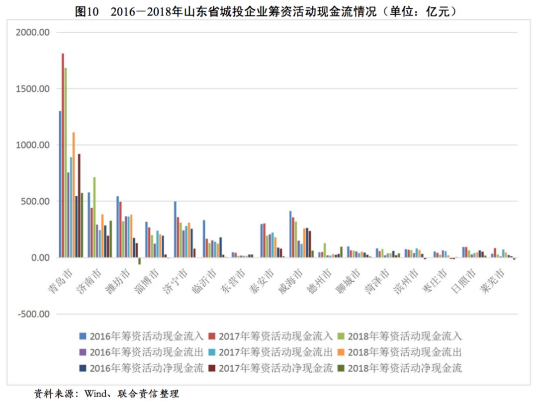 從各地級(jí)市城投企業(yè)籌資活動(dòng)現(xiàn)金流狀況看,2016-2018年,青島市、濟(jì)南市和德州市城投企業(yè)籌資活動(dòng)現(xiàn)金流入波動(dòng)上升,年均復(fù)合增長(zhǎng)率分別為13.80%、11.08%和65.37%,其余地級(jí)市城投企業(yè)籌資活動(dòng)現(xiàn)金流入均呈波動(dòng)下降趨勢(shì),山東省大部分地級(jí)市城投企業(yè)籌資力度有所下降。反觀籌資活動(dòng)現(xiàn)金流出情況,近三年除臨沂市、東營(yíng)市、泰安市和棗莊市城投企業(yè)籌資活動(dòng)現(xiàn)金流出有不同程度下降外,其余地級(jí)市城投企業(yè)籌資活動(dòng)現(xiàn)金流出均有所增長(zhǎng)。受流入減少、流出增多趨勢(shì)的共同影響,山東省大部分地級(jí)市城投企業(yè)籌資活動(dòng)凈現(xiàn)金流均大幅下降,但經(jīng)濟(jì)實(shí)力較強(qiáng)的青島市和濟(jì)南市仍保有較大規(guī)模的籌資活動(dòng)現(xiàn)金凈流入。從籌資活動(dòng)前凈現(xiàn)金流看,2018年除淄博市和萊蕪市為凈流入以外,山東省其余各地級(jí)市均為凈流出態(tài)勢(shì),其中青島市、濟(jì)南市和泰安市資金缺口最大。從籌資活動(dòng)后凈現(xiàn)金流來看,2016-2018年,山東省地級(jí)市城投企業(yè)籌資活動(dòng)后凈現(xiàn)金流整體呈下降趨勢(shì),其中青島市、濟(jì)南市、濰坊市、泰安市和臨沂市在2018年降幅明顯,上述地級(jí)市的城投企業(yè)融資壓力明顯加大。