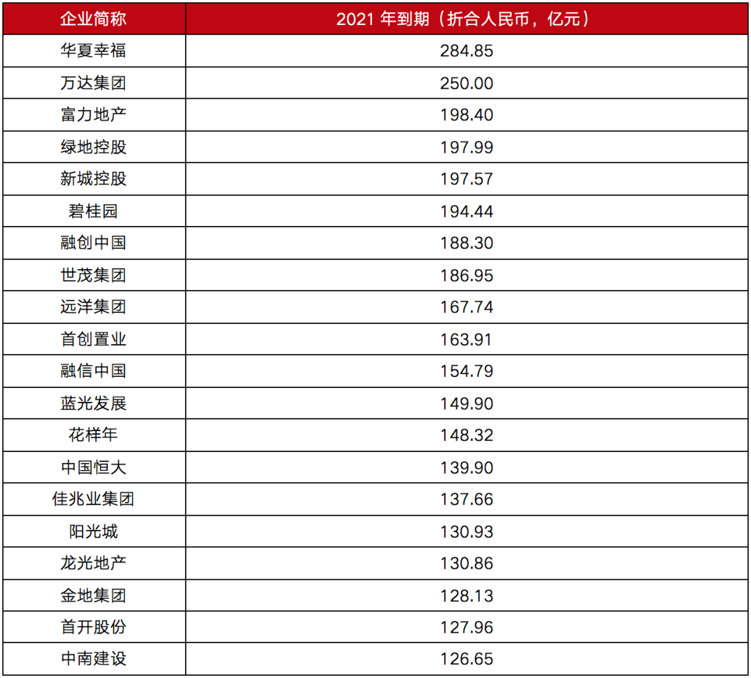 由于目前政策供需兩端限制房企融資,面對2021年的償債高峰,雖部分房企提前償還了共計約460億元的債券,但數額較小。具體企業而言,2021年到期債券最高為華夏幸福,需償還284.85億元,其次為萬達集團,兩家企業均突破二百億元。整體來看,房企償債及經營壓力巨大,未來可能誕生更多的債券違約。