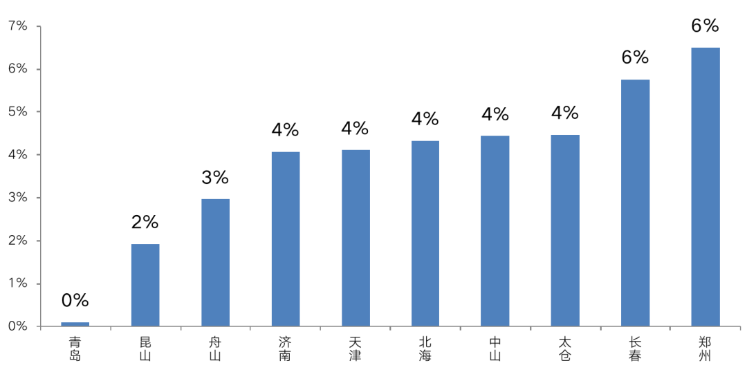 分城市來看,24個重點一二線城市中供求比超1.3的城市達到了三成,其中太原、濟南、合肥等城市表現尤為突出,供求比均超1.35,土地流拍占比相對較高。CRIC監測的重點城市流拍數據(按幅數)顯示,三城均是流拍率TOP10城市,流拍率都超過了12%,均是流拍的“重災區”。即便是成交地塊,溢價率水平也相對較低,以今年商品房市場表現欠佳的濟南為例,涉宅土地溢價率僅有4%,多宗土地為底價成交,土地市場非常蕭條。