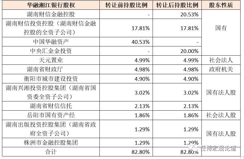 本次轉讓后,意味著華融資產將退出華融湘江銀行的股東序列,湖南財信系以湖南財信金融控股、湖南財信投資控股和湖南財信信托的名義合計持有華融湘江銀行40.47%的股權,成為后者的第一大股東,而中央匯金則以20%的持股比例成為華融湘江銀行的第二大股東。