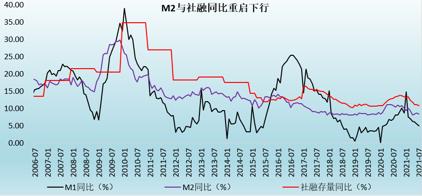 雖然M1、M2與社融同比已經回落到潛在經濟增速附近,且后續財政政策發力以及政府債券發行節奏加快雖可以在一定程度上支撐社融,但監管環境仍趨嚴的背景下,地產調控節奏很難有明顯變化,居民中長期貸款改善空間不大,預計實體經濟融資需求亦將繼續處于弱勢、難有明顯改善,基于此判斷后續幾個月社融收縮態勢仍將延續。