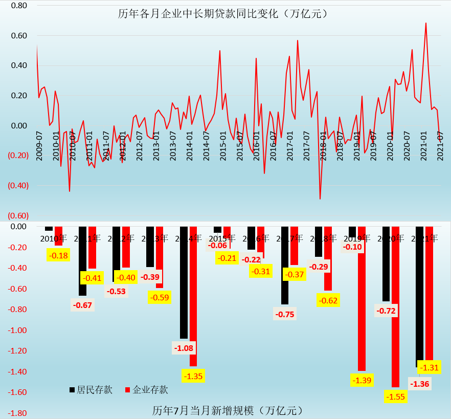2021年7月,企業中長期貸款新增0.49萬億,同比少增0.10萬億,這是自2020年2月以來,企業中長期貸款同比首次出現少增。由于企業中長期貸款代表著企業主動擴大產能的意愿,這意味著目前企業主動生產的意愿并不強,資金可能已經出現脫實向虛的跡象,值得政策部門關注。