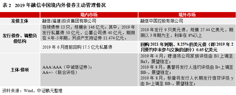 2019年2月8日公告,公司對4只2021年到期的8.25%優(yōu)先票據(jù)中未償付的部分采用“交換要約+同意征求”方式進行負債管理,同時面向合格持有人發(fā)行額外新票據(jù),來滿足延長現(xiàn)有債務期限,和對1年內到期中長期債務進行再融資的需求。具體內容見下表。