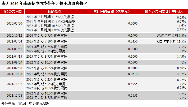2020年來,融信中國累計多次主動回購存續(xù)美元債,調整負債結構,增強市場信心,且多在債券到期日之前進行。2021年共發(fā)行11億美元債券,回購約1.24億美元,其中2021年和2022年到期的約0.49億美元。