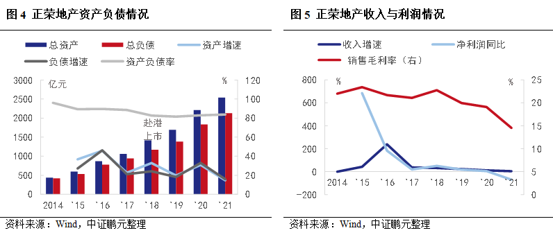 具體來看,2021年正榮地產毛利率大幅下降4.5個百分點至14.6%,聯(lián)合投資占比提升,少數(shù)股東損益占比提升至32.34%,歸母凈利潤同比下降69%,盈利能力有待提升。受土地新政影響,2021年平均拿地成本同比增長37.3%。截至2021年末,公司土地儲備集中在長江三角洲和海西,占比62%,一二線城市占比82%,項目再投資壓力較大。截至2021年末,正榮地產凈負債率85.5%(前值64.7%),現(xiàn)金短債比約1.1(前值2.2),剔除預收賬款的資產負債率74.9%(前值76.6%),處于黃檔。此外,一年內償還的債務大幅增長76%至344億元,其中,債券約64.94億元,而貨幣資金147億元,非受限現(xiàn)金短債比下降至0.43,未來償債壓力加大。