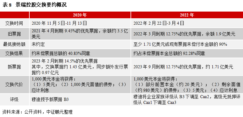 例如, 2020年3月17日,廣匯集團完成對2020年3月30到期7.875%的優(yōu)先票據(jù)的置換,新票據(jù)將于2021年9月23日到期,利率9.5%。1,000美元本金的交換代價除1,015美元新票據(jù)外,還有30美元現(xiàn)金和應計利息。彼時,標普和穆迪均表示,不將本次交換要約視為折價交易,維持B和B2的評級。但也因為公司流動性尚未到枯竭的境地,接受要約的比例僅為19.36%。再例如,綠景中國2020年2月20日,對2020年到期8.5%的優(yōu)先票據(jù)發(fā)起交換要約,最終約未償本金的56.85%同意交換,新票據(jù)本金4.5億美元(其中,額外發(fā)行新票據(jù)約2.23億美元),票面利率12%,將于2023年到期。1,000美元本金的交換代價為1,000美元新票據(jù)和應計利息。此次交換要約,惠譽授予新票據(jù)B的評級。