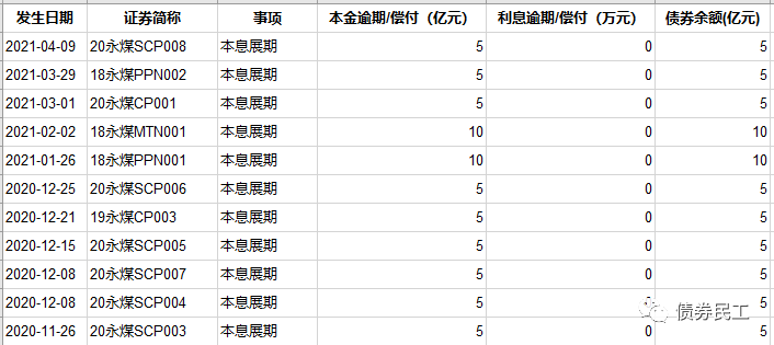 自2020年11月10日“20永煤SCP003”首次債券違約之后,永煤集團目前已經對11只債券進行了展期,債券展期金額合計為65億元。永煤集團最新的主體信用評級為B(中誠信國際)。