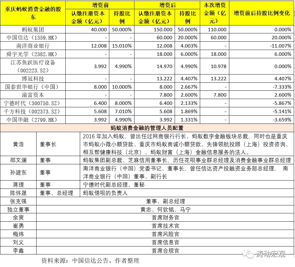1、中國信達、舜宇光學、博冠科技、渝富資本等四家為新進股東。其中,渝富資本的進入可能是因為考慮到重慶螞蟻消費金融本身注冊在重慶這一因素。