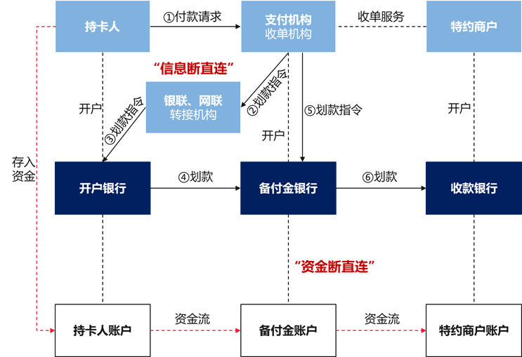 資金斷直連:自2017年4月17日起, 支付機構應將客戶備付金按照一定比例交存至指定機構專用存款賬戶, 首次交存的平均比例為20%左右,  最終將實現全部客戶備付金集中存管。