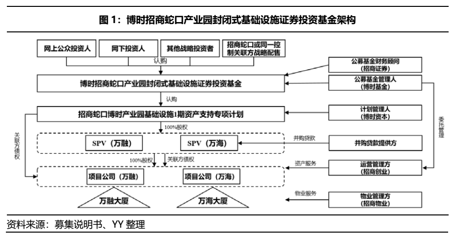 目前,我國公募基礎設施REITs采用公募基金+資產支持證券的架構。以博時招商蛇口產業園封閉式基礎設施證券投資基金架構(已受理)為例,從下往上看,需要先有項目公司(即裝存底層資產),然后向上由特殊目的公司(SPV)去持有項目公司的權益,并且以該收益權為底層資產來發行資產支持證券,之后頂部由公募基金去持有這些ABS。最后一層結構是,投資人通過購買公募基金的份額來享有底層資產的收益權,以此完成資產收益從項目公司向投資人的層層傳導。