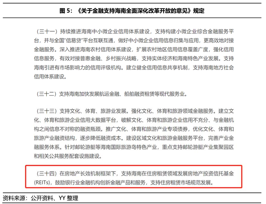 2021年3月20日,在央行等四部門發布的《關于金融支持海南全面深化改革開放的意見》中提到:在房地產長效機制框架下,支持海南在住房租賃領域發展REITs。以此推斷,海南很有可能成為我國商業地產REITs的試驗田。