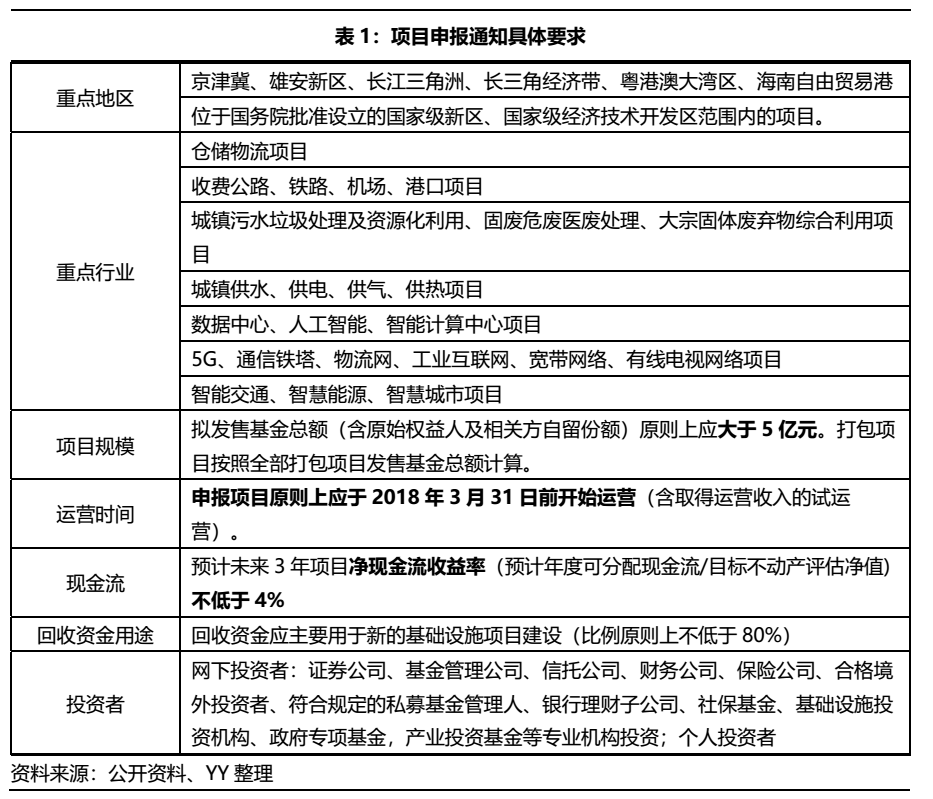 2020年8月3號發布的《關于試點項目申報通知》(下稱“通知”)明確,優先支持基礎設施補短板行業,鼓勵(鼓勵是三大方面)信息網絡等新型基礎設施,以及國家戰略性新興產業集群、高科技產業園區、特色產業園區等開展試點,并在項目規模、運營時間、現金流、回收資金用途等方面做出了具體的規定,見下表。