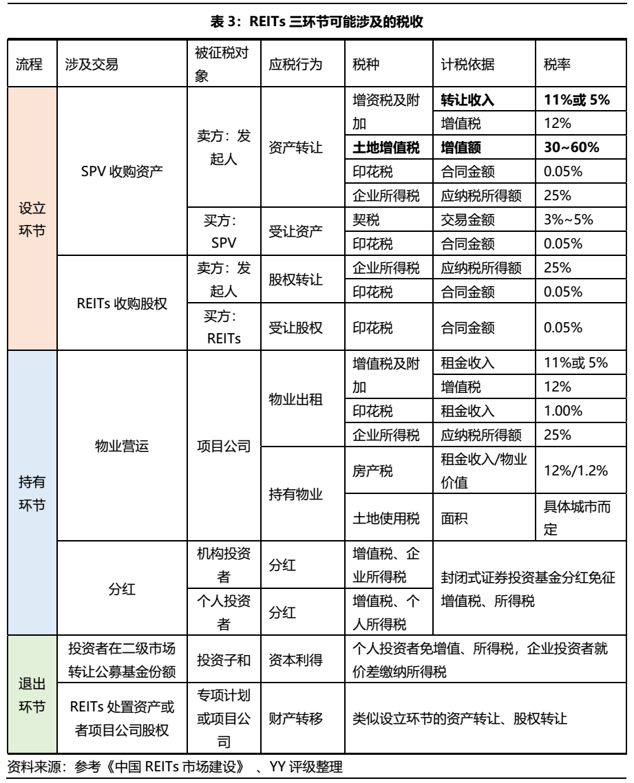 ①稅負重。在REITs設立階段,若采用SPV收購資產的方式,在資產轉讓中會就產生土地增值稅,而增值部分的征收比例在30~60%之間,是稅負最重的一種潛在稅收,在退出階段亦是如此,高稅負會降低持有人的發行意愿和REITs產品的收益率。
