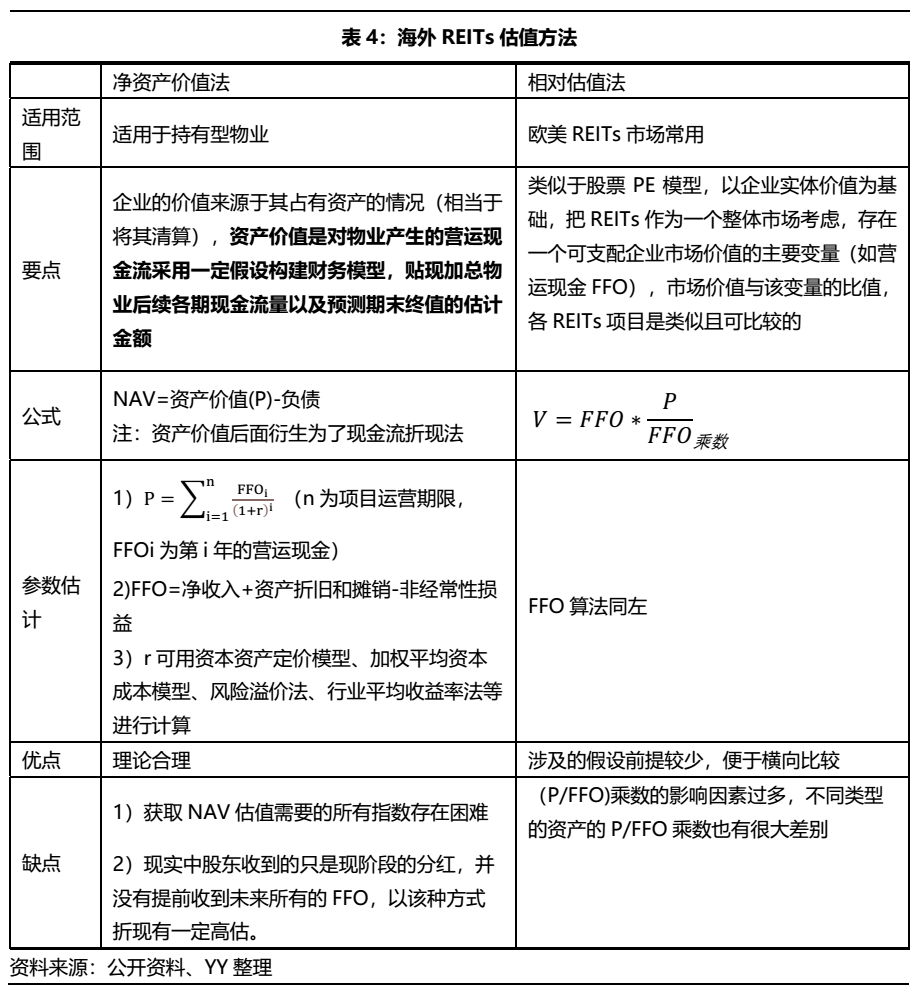 目前海外市場對REITs的估值主要有兩種方法:絕對估值法(凈資產法,又叫NAV法)和相對估值法(P/FFO乘數法),NAV法主要適用于持有型物業,P/FFO在歐美市場上較為常用,具體要點如下。