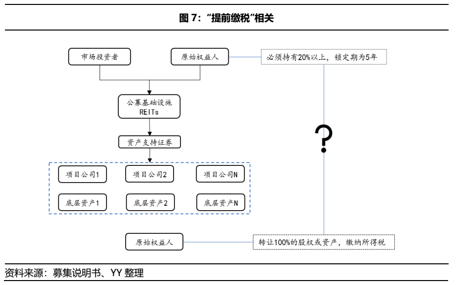 ③提前繳稅。根據《指引》規定,基礎設施資產原始權益人需要將項目公司的全部股權向REITs轉讓,該環節肯定要繳納企業所得稅。但是在REITs配售階段,原始權益人必須參與REITs戰略配售,持有不少于20%的份額,鎖定期為5年。這就意味著原始權益人實際上出讓了80%資產的收益,但繳納了100%資產口徑的稅收,且自持的20%份額只能在5年之后變現或轉讓,這就意味著這20%的部分是提前納稅的。