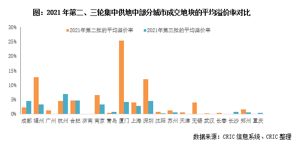 相較于招拍掛,收并購獲得的二手項目歷史遺留問題復(fù)雜,面臨諸多風(fēng)險,對房企整體的投資眼光、盡調(diào)和資產(chǎn)評估能力提出較高要求。通常上,收并購作為招拍掛拿地的替代方式,當(dāng)土拍競爭激烈時,收并購現(xiàn)象可能頻繁。而2021年第二、三輪集中供地溢價率大幅下滑,單項目利潤率相對充足,優(yōu)質(zhì)房企對收并購的意愿可能降低,更傾向于獲取土拍市場回報率容易評估的項目。