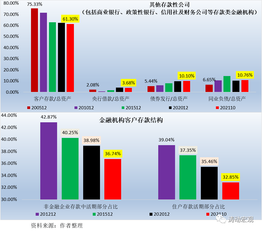 截至2021年10月底,客戶存款、債券發行以及央行借款占存款類金融機構總資產的比例分別為61.30%、10.10%和3.68%。而從趨勢上看,客戶存款占比趨于下降,由2005年的75.33%連續下降至2010年的71.22%、2015年的62.75%和2020年的62.31%;債券發行占比趨于上升,由2005年的5.44%連續提升至2010年的6.15%、2015年的8.03%和2020年的9.79%。