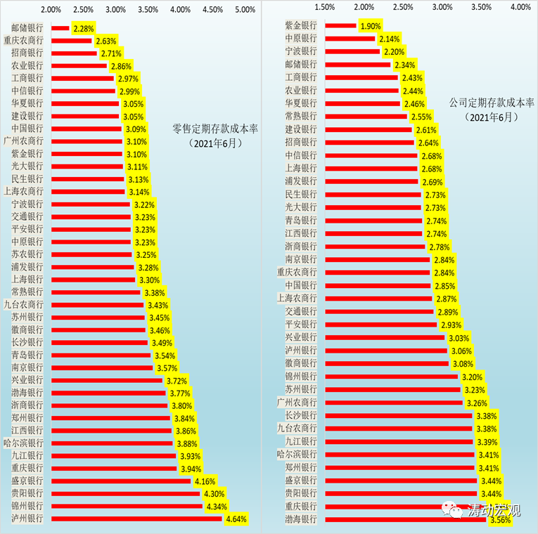 我們統計了上市銀行今年上半年的定期存款成本情況(詳情參見全部57家上市銀行主要指標排名(截至2021年6月底)),發現目前上市的存款成本分化比較明顯,其中,存款成本較高的銀行市場認可度大多不高。例如,零售定期存款利率、公司定期存款利率的最高值與最低值分別相差236BP與166BP。