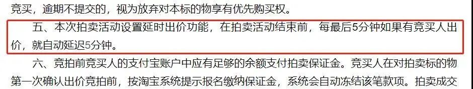 有5分鐘的延時周期,即拍賣10點結束,但有人9:56出價,則拍賣延長至10:01分結束,5分鐘內的每次出價都會觸發延時,直至無人出價為止。但如果只有1個人參拍,最后就以起拍價成交。
