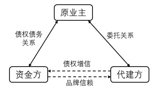 (2)代建方投入意愿較強而引入資金方。在過去幾年中,部分房企為沖規(guī)模,往往在忽視項目客觀資質的情況下大量獲取項目,而對于部分資質較差的項目代建方往往以為通過“融資代建”的模式可以最大限度隔離風險,因而利用自身商業(yè)信譽人為強行引入資金方。在這種情形下,資金方基于代建方商業(yè)信譽背書而投入的可能性即大大增加。