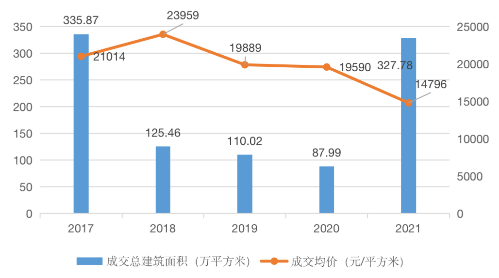 圖:重點(diǎn)8城2017年7月-2021年10月自持用地年度成交走勢