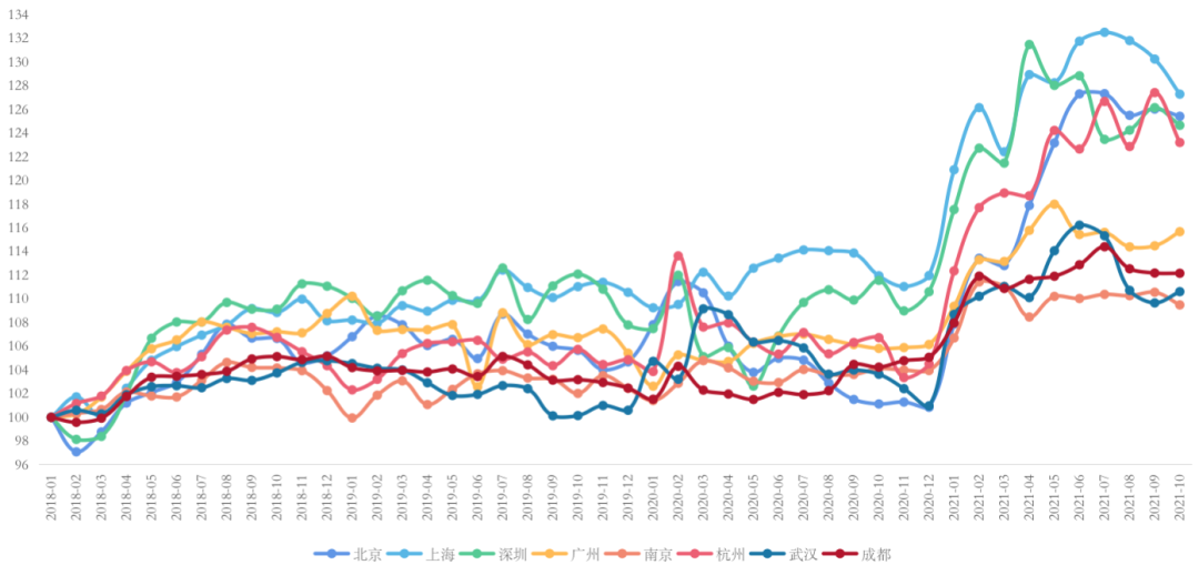 聚焦重點(diǎn)8城,以2018年1月為基期,核心8城租賃價(jià)格指數(shù)出現(xiàn)下降。截至2021年10月,8城市租賃價(jià)格指數(shù)區(qū)間仍然位于97.09-132.5,城市間差異較大。其中,上海租賃市場的發(fā)展的持續(xù)性和穩(wěn)定性最好。受租金調(diào)控影響,北上深杭四城租賃指數(shù)均呈現(xiàn)不同程度的下跌趨勢,而廣州租賃市場近期表現(xiàn)較差,已跌出第一梯隊(duì)。