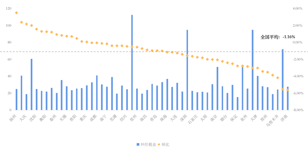 55城個(gè)人房源量價(jià)齊跌。具體數(shù)據(jù)來看,10月,55城個(gè)人房源租金為33.32元/平米/月,同比去年上升8.53%,較上月環(huán)比下降1.16%。從城市來看,10月租金環(huán)比下降的城市多達(dá)40個(gè),超七成城市租金下降,杭州和濟(jì)南環(huán)比降幅最大,均超5%。