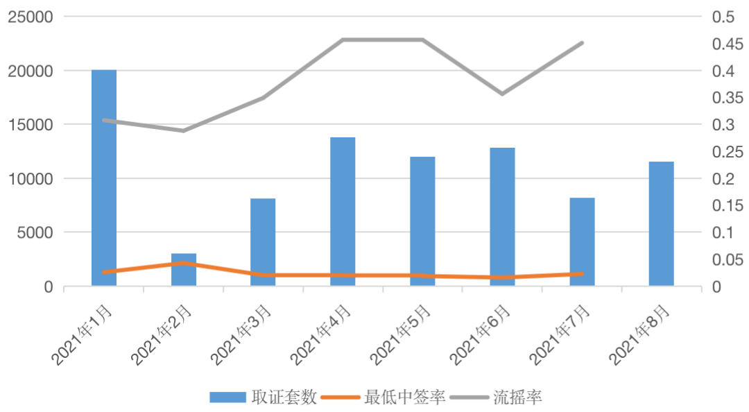 圖:2021年1月-8月16日杭州單月取得預售證情況(單位:套、%)