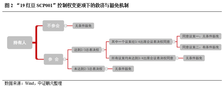 第二,持有人會議議事效率不高。在實踐中,保護性條款需要通過在持有人會議的基礎上達成持有人意見統一來行使約定的權利,但經常存在持有人會議參會人數不達標準,或者所有議案均未通過的情況,進而導致處置效率較低。對此,根據《范例》,部分債券在非交叉保護條款中約定,當出席持有人會議人數未達標準、或表決全部議案未達通過標準時,視為無條件豁免。例如,“21潤達醫療MTN001”、“19紅豆SCP001”。據此,持有人不論是否參會,豁免決議均生效,而參會僅可以決定是有條件豁免還是無條件豁免。此類約定,一方面,可以促使持有人積極參與,并作出意思表示,但另一方面,對于一個本身積極參會的人,可能不利于其意思表示。例如,某只債券僅有一位持有人,且積極參會并堅持“不同意”豁免,在一般表決機制下,會得到不同意豁免的結果,債券加速到期,但若為上文所述的情形,則得到“無條件豁免”的結果。在此情況下,同意“有條件豁免”是他的最優選擇,或為此類條款的設置意圖。