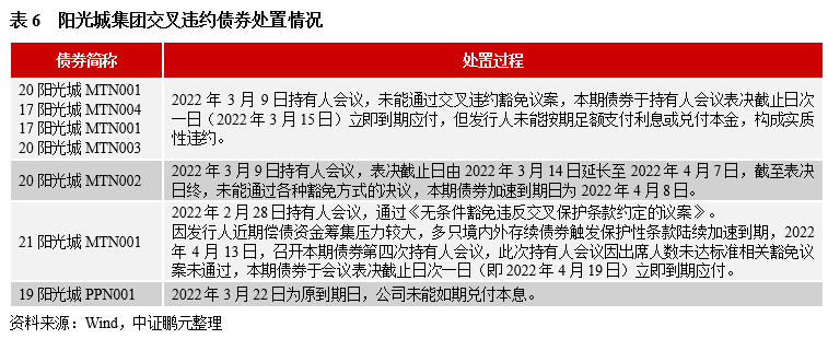 受企業償債風險顯露影響,不包含保護性條款的債券觸發持有人會議召開條件。例如,2022年4月11日,“20陽城01”、“20陽城02”、“20陽城03”、“20陽城04”、“21陽城01”、“21陽城01”、“21陽城02”由債券受托管理人作為會議召集人召開持有人會議,審議的議案中包括增加增信措施,變更《募集說明書》及《受托管理協議》違約責任等。截至表決日中,僅“21陽城01”通過變更違約責任的議案,為此,其他債券均觸發約定的違約情形,其中,“20陽城04”因未達出席比例,根據約定該次持有人會議無效。