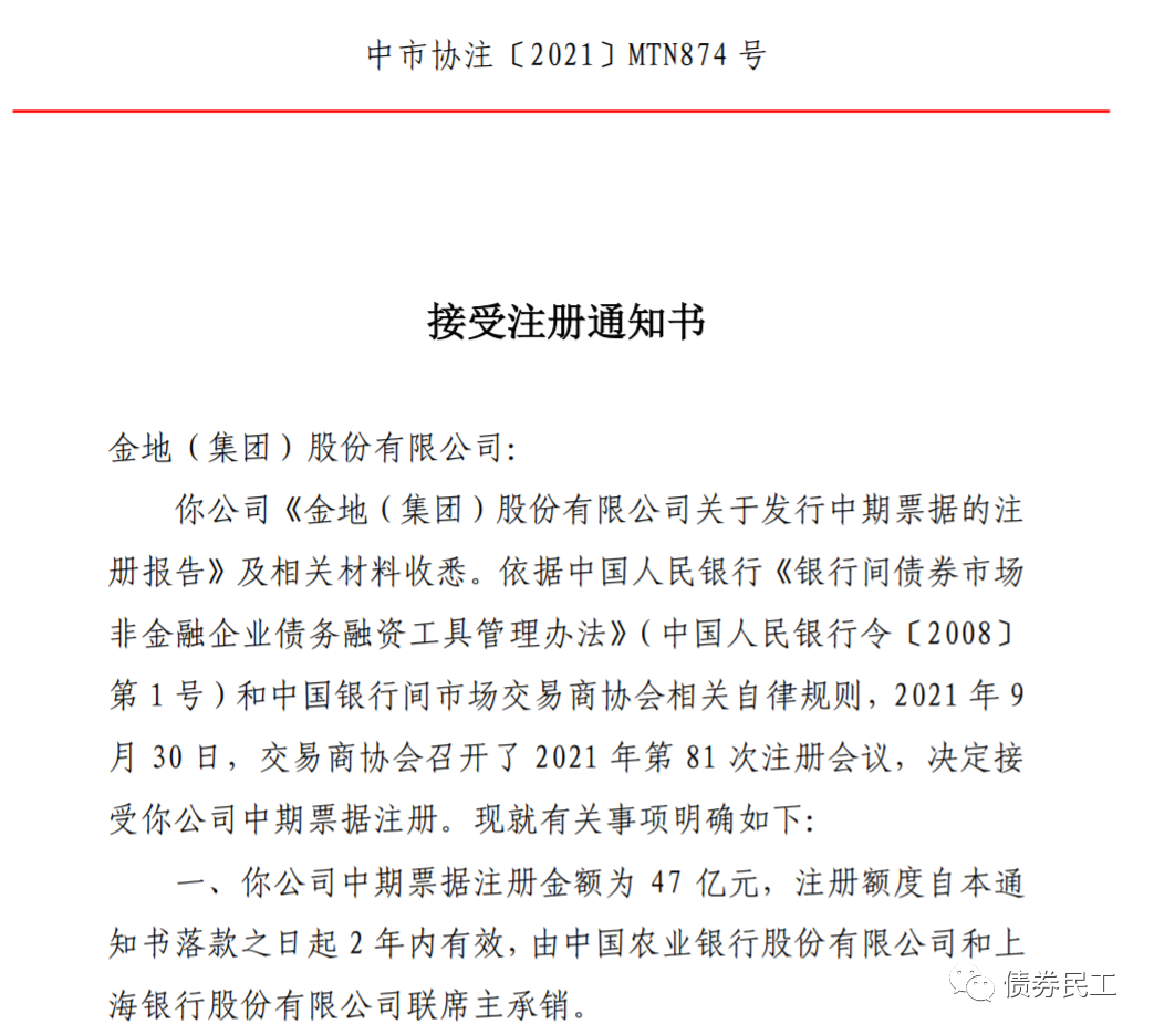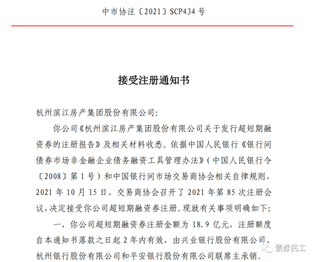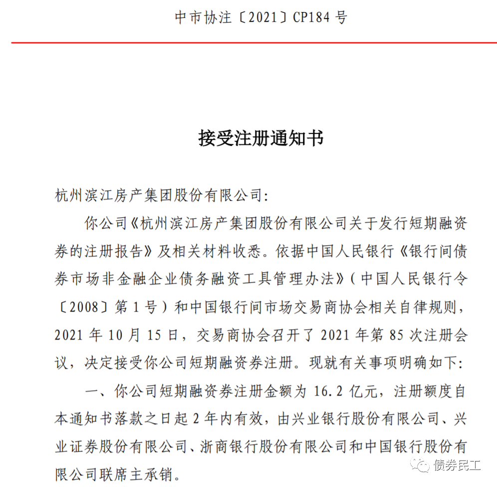 根據(jù)中國銀行間市場交易商協(xié)會網(wǎng)站的公開信息,交易商協(xié)會于2021年11月24日接受金地(集團)股份有限公司、中交房地產(chǎn)集團有限公司和杭州濱江房產(chǎn)集團股份有限公司三家房地產(chǎn)公司總金額合計為135.60億元債務融資工具產(chǎn)品的注冊,具體債務融資工具產(chǎn)品注冊情況如下: