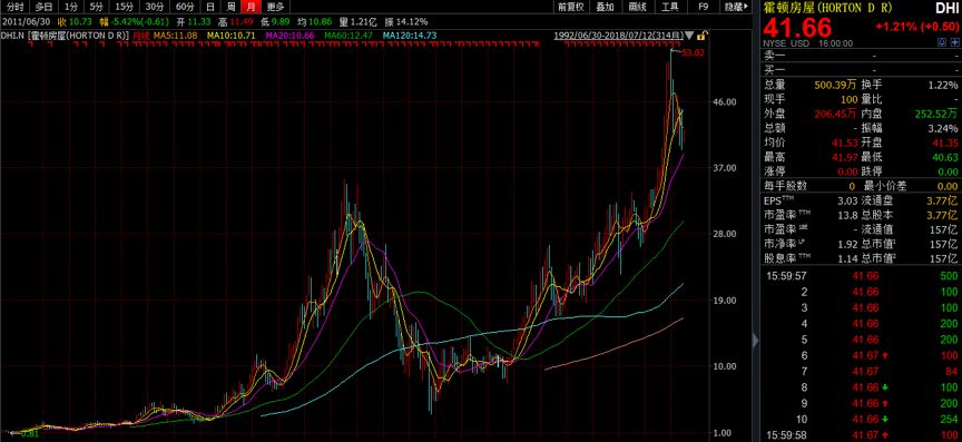 霍頓房屋于1992年登陸紐交所,隨后開始不斷擴大業務規模。目前,霍頓在美國26個州的79個市場開展業務。從2002年開始,連續16年為全美銷量第一的開發商。感受下霍頓房屋的股價走勢: