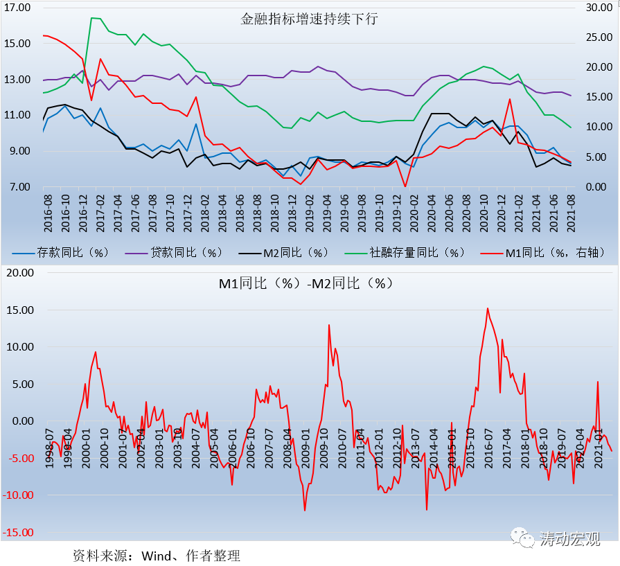 (一)今年8月,存款增速、貸款增速、M2增速與社融增速繼續(xù)下行至8.30%、12.10%、8.20%和10.30%,環(huán)比分別下行0.30個百分點、0.20個百分點、0.10個百分點和0.40個百分點,較2020年以來的高點分別下行2.40個百分點、1.10個百分點、2.90個百分點和3.40個百分點,可以說基本上已經(jīng)回到名義經(jīng)濟增速附近。這里更值得關注的是M1增速這一指標,今年8月M1增速降至4.20%,環(huán)比下行0.70個百分點,較2020年以來的高點更是大幅下行10.50個百分點。