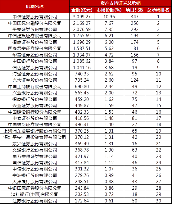 一、全市場ABS總承銷排名