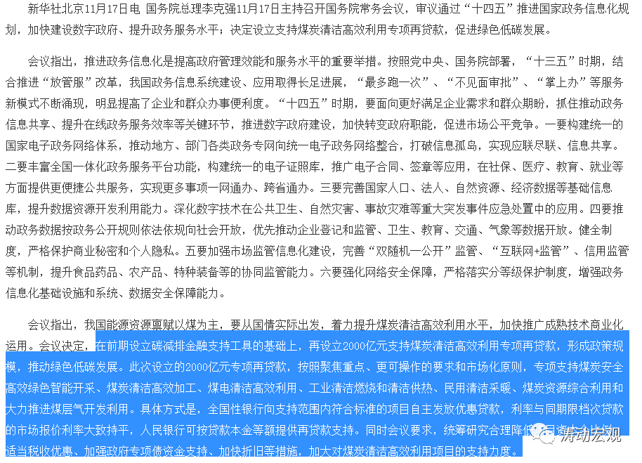 (一)除碳減排支持工具和2000億元專項再貸款外,11月17日的國務院常務會議還提出要“統籌研究合理降低項目資本金比例、適當稅收優惠、加強政府專項債資金支持、加快折舊等措施,加大對煤炭清潔高效利用項目的支持力度”。