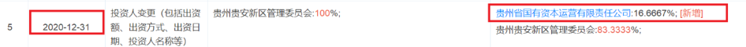 1、2020年12月31日,貴州國資公司成為貴安新區產業發展控股集團有限公司(中誠信國際主體信用等級AA,實際控制人貴安新區管委會)持股比例為16.6667%的股東。