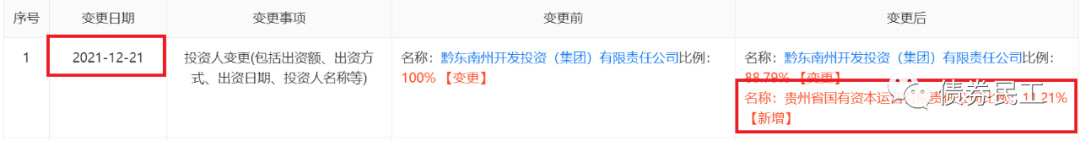 3、2021年12月21日,貴州國資公司成為黔東南州交通旅游建設投資(集團)有限責任公司(中誠信國際和中證鵬元主體信用等級AA,實際控制人黔東南州國資委)持股比例為11.21%的股東。