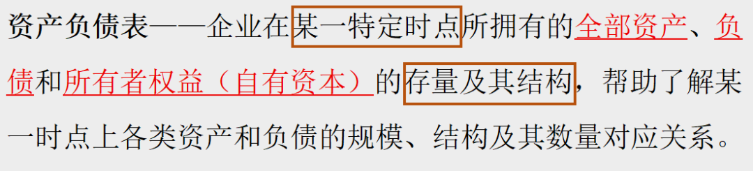 今天我們先講資產負債表。資產負債表是一張平衡表,負債表左邊表示資產結構,右邊表示資產來源。會計恒等式,為,資產=負債+所有者權益。