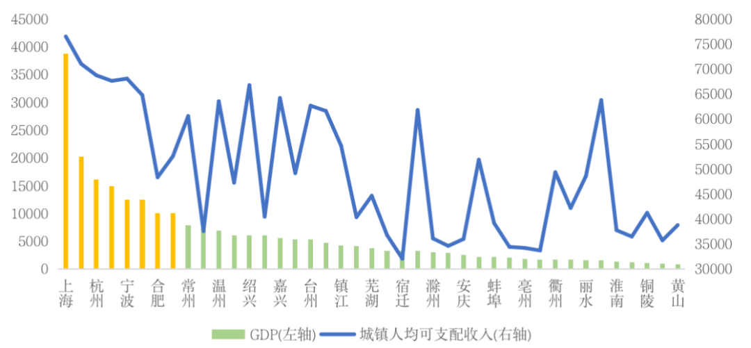 其中,上海、蘇州兩城2020年城鎮居民人均可支配收入更是超7萬元/人,上海城鎮居民可支配收入高達76437元/人,居全國之首;其次,杭州、寧波、南京、紹興、無錫、嘉興、舟山、溫州、臺州、湖州、金華、常州等城市城鎮居民人均可支配收入均超6萬元/人,在全國也居于前列。
