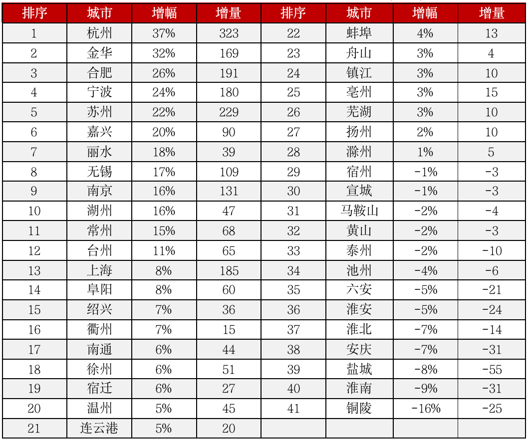 浙北和蘇南的城市雖然在教育水平和勞動力比重上不及上述核心城市,但由于民營經濟發達,購買力也不容小覷,尤其是近十年人口增量比較突出的金華、嘉興等城市,需求支撐性較佳。