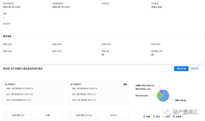實務中線下債權人會議簽到也動輒需要一個小時,經常是通知九點鐘開會,實際上簽到結束后九點半甚至十點才能開會;在統計表決票時更覺緊張,需要在短時間內進行唱票和計票完畢,并統計出結果。本次債權人會議相比省時省力許多, 14:00準時開會,15:00開會完畢,法官宣布投票之后,短短的5分鐘之內便統計出線上和線下的合計投票結果,高效便捷。