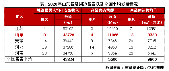 人口支撐購房需求,居民購買力催生購買意愿。山東省作為人口大省,商品房市場購房需求大,2020年全省商品房銷售總額約1.11萬億元,占全國商品房銷售額的6.4%,排名第四。城鎮居民人均可支配收入為43726元,略低于全國平均,但高于周邊除江蘇外的其他省份。就居民購買力來看,商品房均價可承受度高,一定程度上能加強居民購買意愿,促進房地產市場進一步發展。