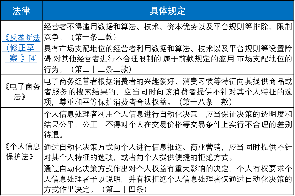 在法律法規(guī)層面,除《反壟斷法》相關(guān)規(guī)定外,《電子商務(wù)法》、《個人信息保護法》等多部法規(guī)都對算法規(guī)制作出規(guī)定,具體如下表所示: