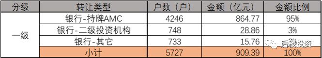 銀行一級市場出包909億,5727戶,銀行-持牌AMC是最主要的資產包轉讓方式。