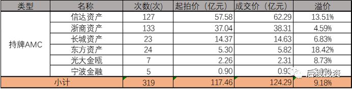 淘寶債權拍賣全年成交492次,成交金額超過160億。其中持牌AMC與銀行出包占了全部成交金額的90%以上,銀行出包溢價率最高。