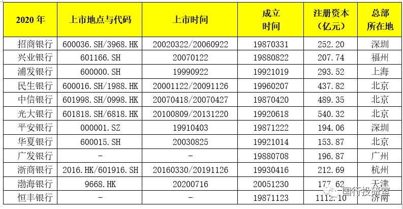 4家總部位于北京(分別為民生銀行、中信銀行、光大銀行與華夏銀行);2家總部位于深圳(招行與平安銀行);1家總部位于福州(興業(yè)銀行);1家總部位于上海(浦發(fā)銀行);1家總部位于廣州(廣發(fā)銀行);1家總部位于天津(渤海銀行);1家總部位于濟(jì)南(恒豐銀行);1家總部位于杭州(浙商銀行)。